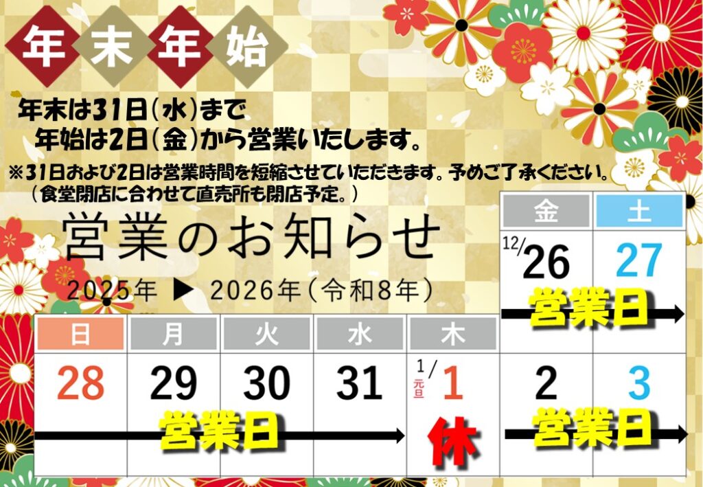 年末は12月31日まで休まず営業となります。年始は1月2日より営業とさせていただきます。